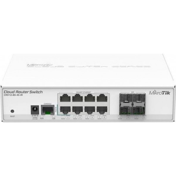 Cloud Router Switch 112-8G-4S-IN is a “small size low cost” member of our CRS series. It comes with eight Gigabit Ethernet ports and four SFP cages.